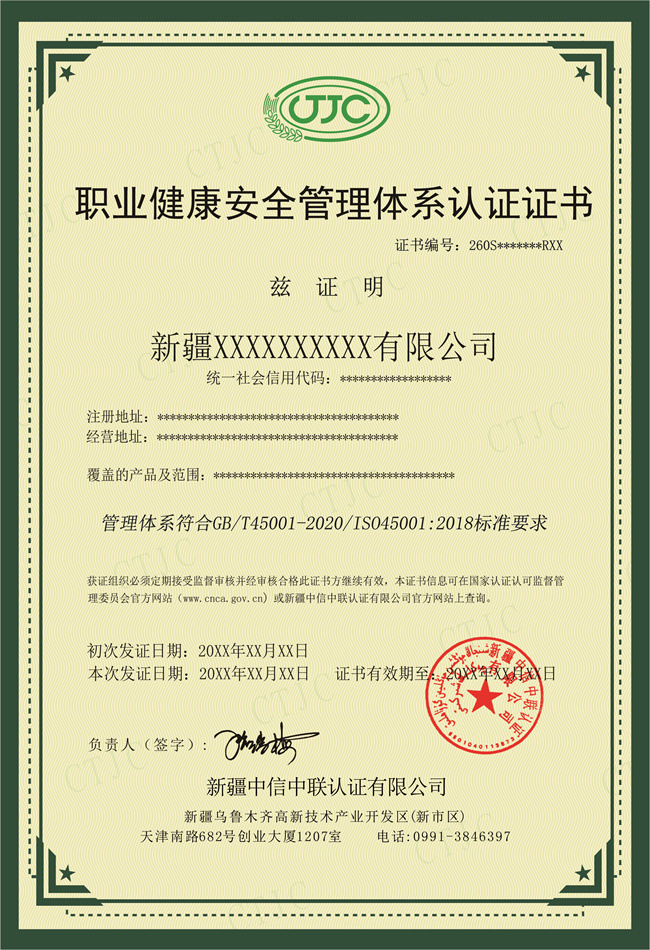 中信中聯(lián)-職業(yè)健康安全管理體系證書(shū)模版